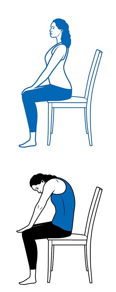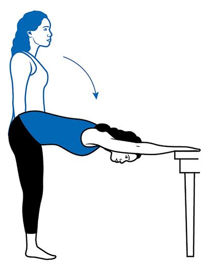 When we sit for long periods, the lower spine contracts and the posterior muscles in our legs, particularly the hamstrings, shorten. A modified yoga down-dog pose using your desk or kitchen table will stretch the entire back of your body. Start by standing, with your chair out of the way, and place your palms flat on your desk.