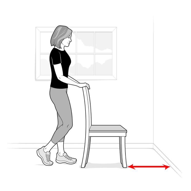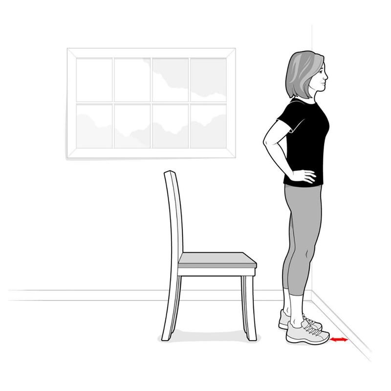 Step 3 Stand facing the wall, chair behind you, feet about four inches from the wall. Place your hands on your hips or stretch them to the sides.