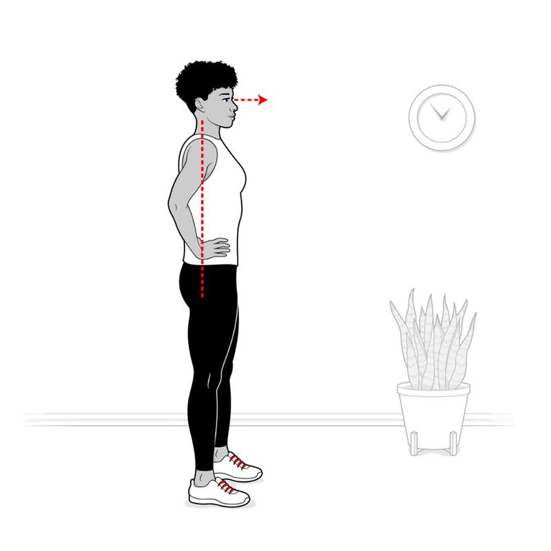 Step 2 Your head and spine should be aligned, chest up, eyes gazing straight ahead. Do not round your back by hunching or arching it.