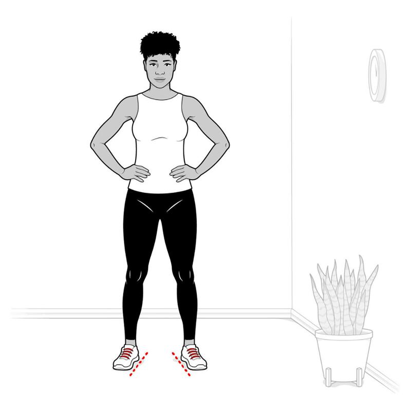 Step 1 Situate your feet about shoulder width apart and facing slightly outward, which is the easiest, most stable stance. Keeping your feet considerably wider or closer together or angled too far in or out, places potentially worrisome loads on the knees or hips.