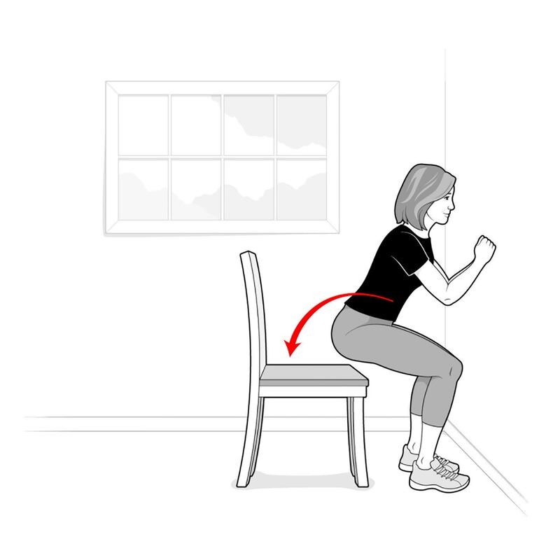 Step 4 Keep your heels glued to the ground. Bend your knees slowly, through a count of five, lower yourself until your buttocks gently touch the box. Try not to actually sit. Rise from the box and straighten your legs through another count of five.