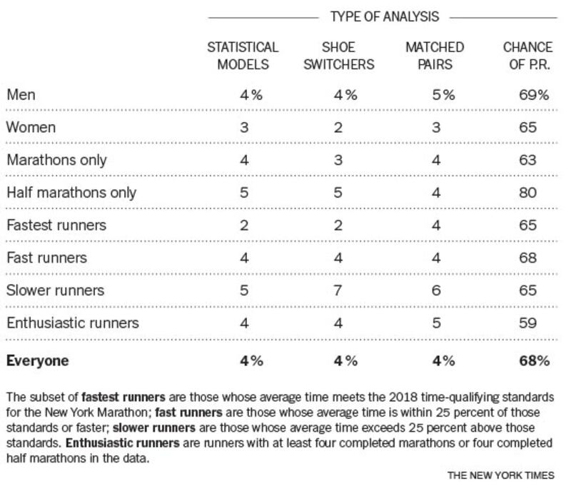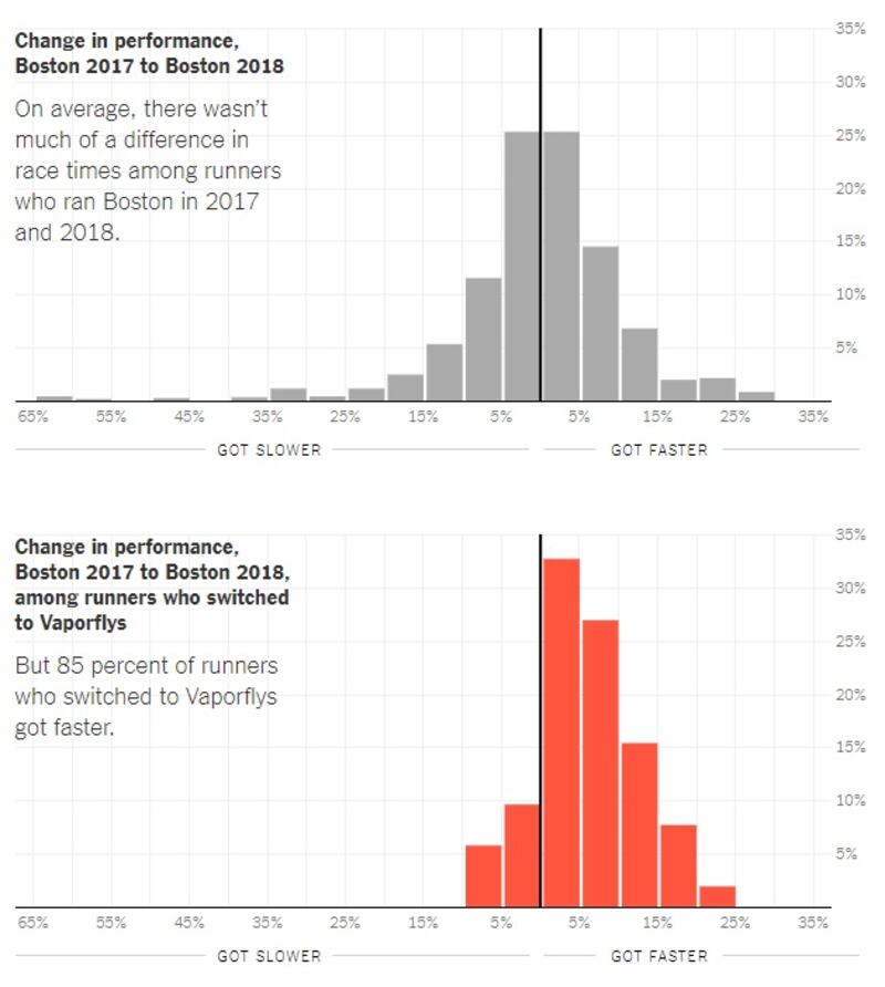 The speed increases associated with Vaporflys are consistent with the increases in a Nike-funded study by University of Colorado researchers published in the journal Sports Medicine. That experiment measured the energy output of 18 male elite runners on a treadmill at various speeds and concluded that, on average, runners in Vaporflys exerted 4 percent less energy than they did in other racing shoes. They estimated such a savings would translate into a performance improvement of around 3 per cent for a 3-hour marathoner. The findings here were similar, but showed a smaller effect. The New York Times analysis found Vaporflys to be 1 per cent faster than the next-fastest running shoe (the Nike Streak), but the sample included a much wider range of athletes, and included men and women.