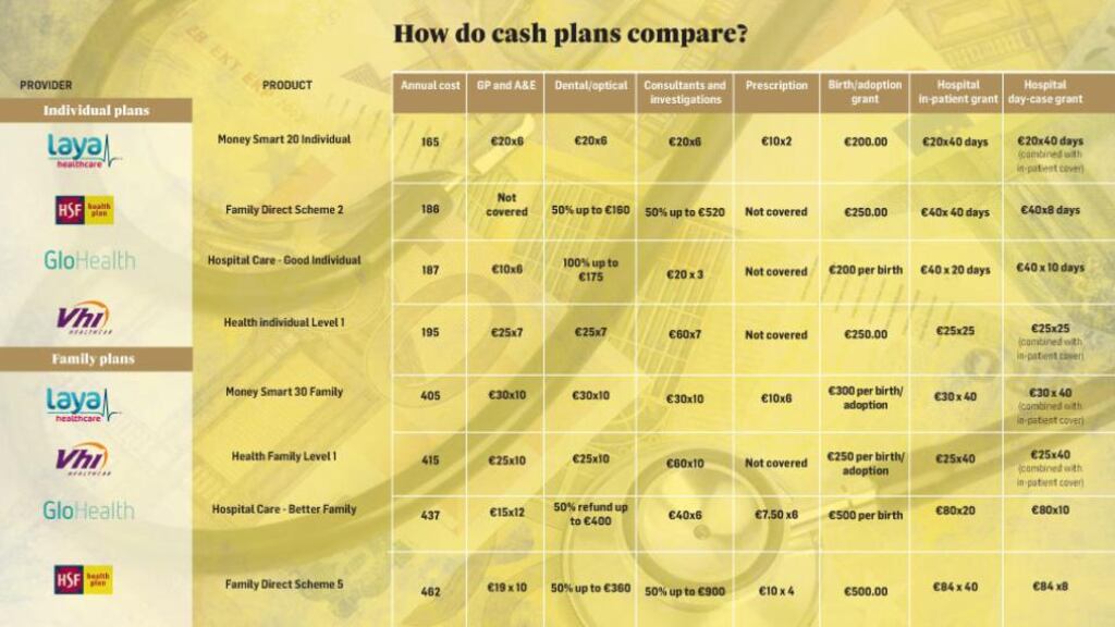 At present, Laya, VHI, Glohealth and HSF Health Plan all offer cash plans. Aviva does not have a licence to do so and says it currently has no plans to introduce such plans.