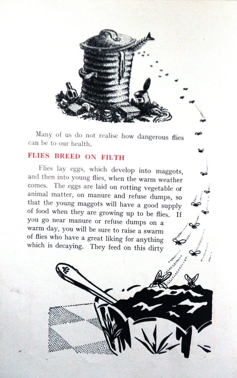 Flies lay eggs, which develop into maggot, and then into young flies, when the warm weather comes. The eggs are laid on rotting vegetables or animal matter, on manure and refuse dumps, so that the young maggots will have a good supply of food when they are growing up to be flies . . . They feed on this dirty stuff, and carry off, in their stomachs and on their legs, the filth and the microbes with which they have been in contact. This would not matter so much, were it not for the fact that these same flies also have a great liking for our food, which attracts them in swarms, crawling over the butter, falling into the milk, getting stuck in the jam, and generally walking over, and into, anything left uncovered in our homes.