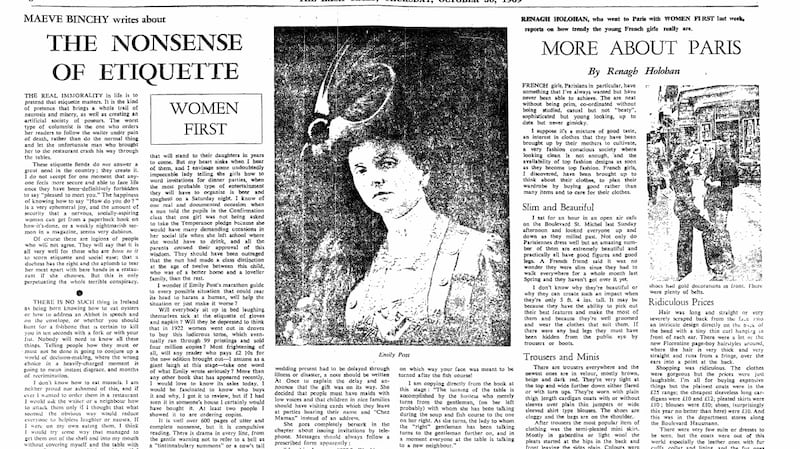Five days after this news report, Binchy used her column on the “Women First” page to get stuck into the “utter and complete nonsense” of etiquette, as outlined in a new edition of American Emily Post’s 1922 guide to the subject, running to more than 600 pages.