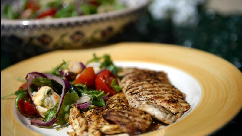 Chargrilled chicken escalopes with an Italian bean, tomato, feta cheese and basil salad