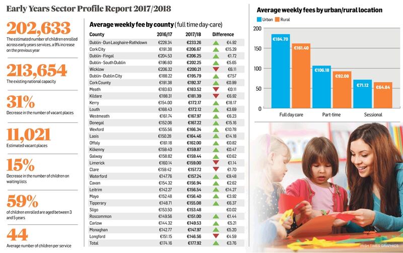 This represents a 24 per cent increase in the past year, which can be mainly attributed to the introduction in September 2017 of universal funding up to a maximum of €20 a week for children younger than three. The erosion of that by fee increases is maybe not as big as had been speculated, with the average fee for a full-time place up almost €4 a week (2.2 per cent) to €178, while the average part-time fee rose 3.3 per cent to €102.