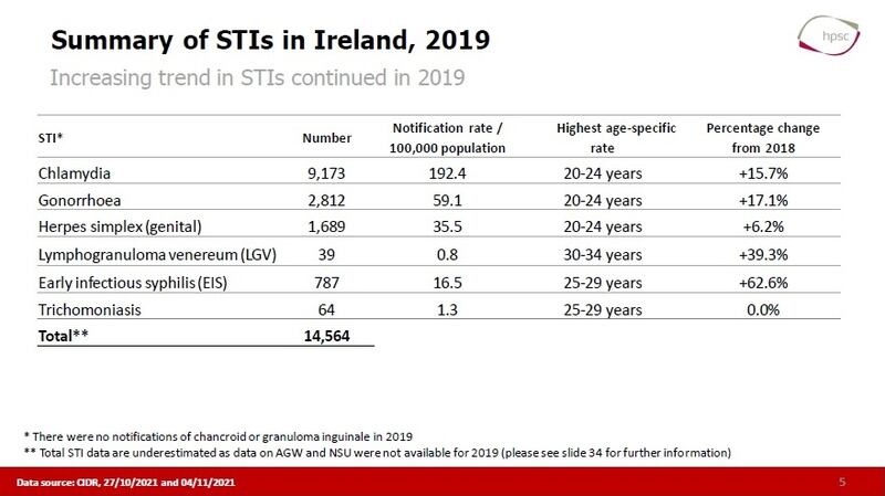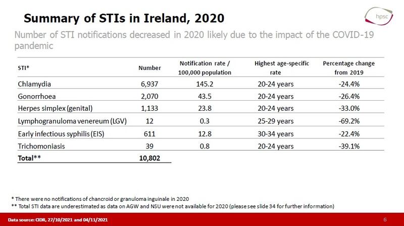 Figures from the Health Protection Surveillance Centre (HPSC) for notifications of STIs in 2019 and 2020 show that those aged 20-24 are most likely to be affected by the three most common infections: chlamydia (the rate among men and women being roughly equal); gonorrhoea (predominantly occurs in men); and herpes simplex (genital), which mostly affects women.