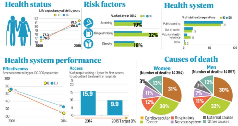 In no small measure these reflect the successful work of our much-maligned health system, the subject of a major new comparative OECD/EU study, State of Health in the EU, which looks at healthcare in the individual member-states of the union (data only up to 2015-16). The study was compiled by the Organisation for Economic Co-operation and Development (OECD) in conjunction with the EU.
