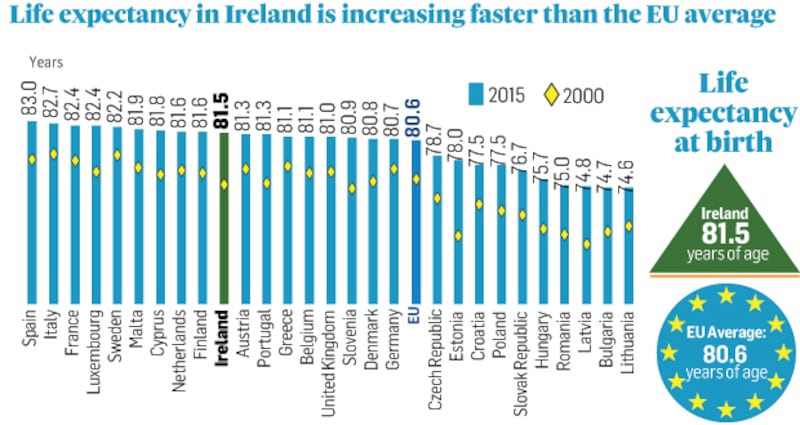 Men and women in Ireland are living on average a remarkable five years more today than they were in 2000 (now, to 81.5 years).