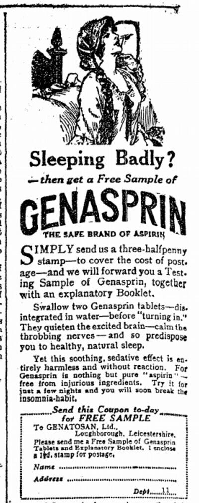 Veronal (barbital) was one drug of choice for the sleepless in the 1920s, leading to many poisoning cases, and the papers of that decade were also populated with ads for many products claiming sedative properties. Genasprin – “pure aspirin” proclaimed that swallowing two tablets in water before “turning in” would “ensure sound, healthy sleep”, while Winox Wine Food maintained that after a glass, “sleeplessness will no longer bother you”.