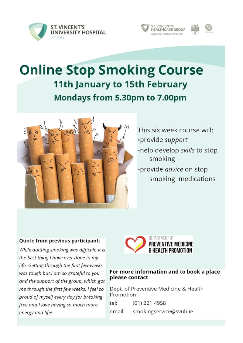 A long-established six-week stop smoking course is held at St Vincent's University Hospital (SVUH) campus in Dublin. However, due to the Covid-19 pandemic, courses have moved online. The course provides group support as well as advice on stop smoking medications. "We set a quit date between week two and week three and participants find it motivating to be answerable to others in the group," explains Ailsa Lyons, head of the Department of Preventative Medicine and Health Promotion at SVUH. Each person is given a one-to-one online session in advance to make sure there aren't any technical issues. The next course runs on Monday evenings from 5.30pm-7pm from January 11th to February 15th. Tel:01 2214958 or email smokingservice@svuh.ie.
