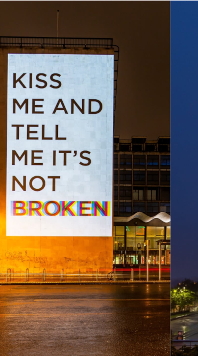 The songwriter Mundy and street artist Aches had never met before their collaboration. Now the words “Kiss me and tell me it’s not broken” from Mundy’s song To You I Bestow are being projected on the side of Busáras, rendered by Aches and animated by his friend Cyan Ryan.