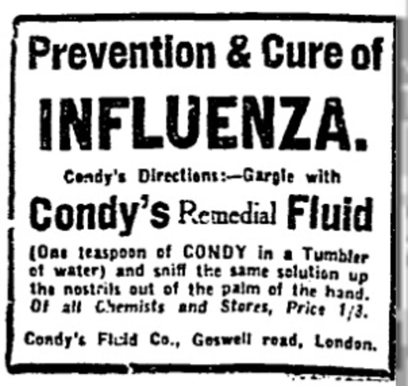Advertisements that month also reflected the times. Condy’s Remedial Fluid claimed to prevent and cure influenza by gargling and sniffing a solution “up the nostrils”. ‘Hall’s Distemper declared: “The Spring of reconstruction is the Spring of Redecoration! . . . To brighten the home and instantly destroy all the germs which have accumulated on walls during the long years of war”.