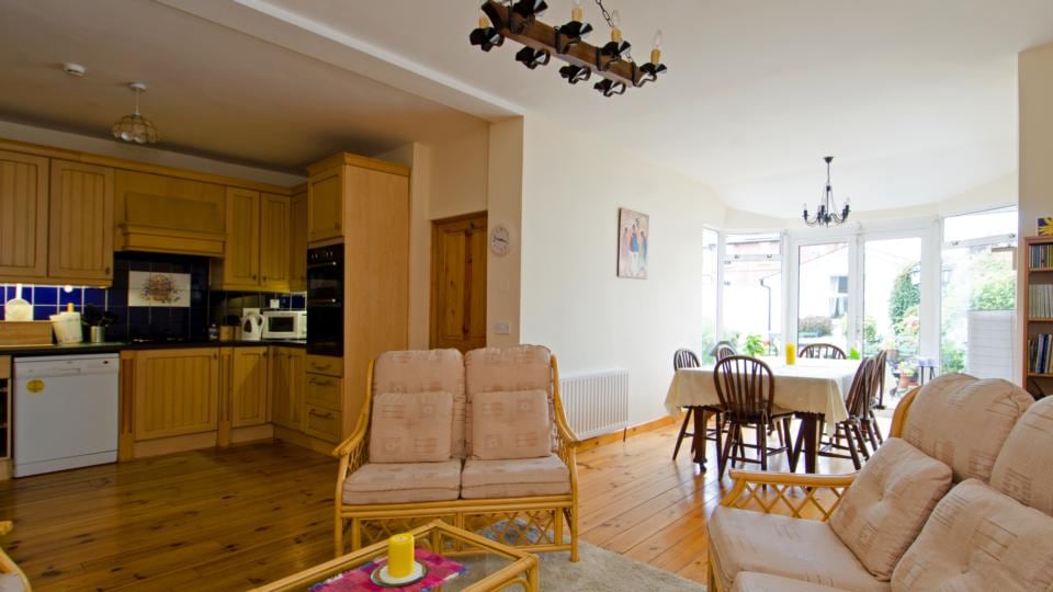 Above them, the attic conversion has two rooms; in one there are twin beds while the other is laid out as a small sittingroom. The house is in mint condition and has a low key, warm and pleasant feel to it. The walls and woodwork are painted and have not a blemish in sight. The wooden doors have been stripped (the hall door has its original leaded-light window) as have the floors – pitch-pine in the older part of the house, pine in the extension – and look like they were varnished last week.