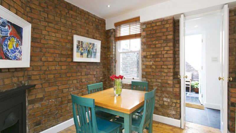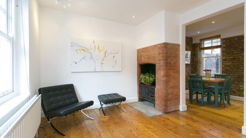 Number 60 was renovated and extended and the mix of pristine white walls and exposed red and yellow brick in the reception rooms make for a nice contrast. The reception rooms have a pared-back look. The owners have dressed the sittingroom with little more than a black leather Mies Van der Rohe Barcelona chair set against white walls. This room has a part-red-brick chimney breast with a black cast-iron stove. A large sash window overlooks the street. The walls of the cute diningroom are mostly exposed brick and there’s a cast-iron fireplace. There’s also a galley-sized fitted kitchen with a slate floor and a rear hall which doubles as a utility area. A small rear west-facing court yard is paved in black flagstones. The shower room has white mosaic tiles and the bedrooms are smart with honey-coloured floor boards and white walls. There’s also a floored attic which is accessed by a Stira stairs, providing a good amount of storage space. There’s also the unusual addition of a decked area above the shower room but access is by ladder, which for some might seem a bit precarious.