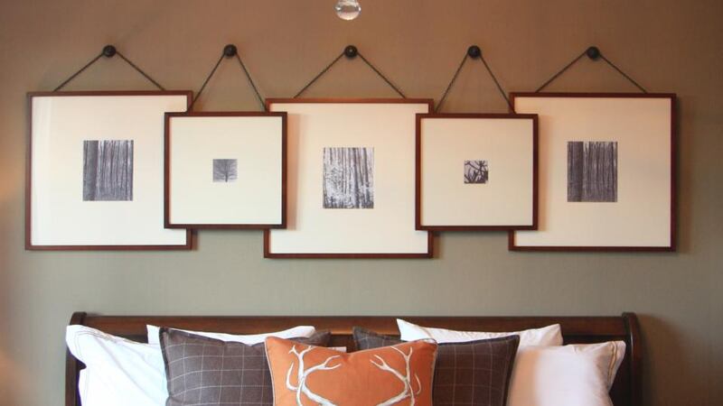 .com) symmetrical solution for prints features 1.2 cm (half inch) wide dark wood square frames ordered in two sizes. By placing the smaller squares on top of the larger one and adding texture through the use of chain to hang them from sizeable knobs she found at Pottery Barn (