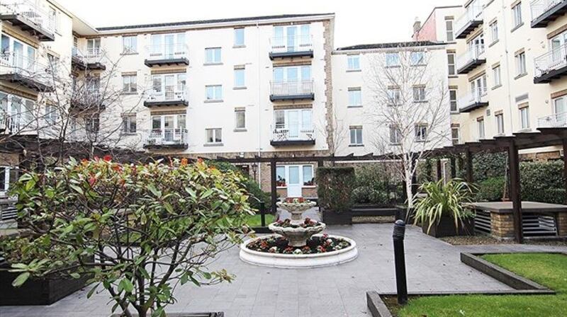 Two-bedroom top-floor apartment in good condition in the heart of Dublin city centre, in a gated development beside Ha'penny Bridge. It has a balcony and communal gardens.