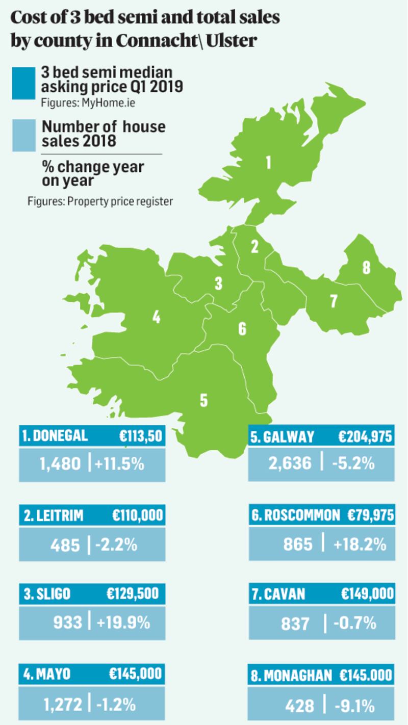 Co Galway ranked fourth for the number of transactions last year with 2,636 sales, but this marked a 5.2 per cent drop on the previous year and may point to a lag between stock available to buy and demand. “For a market like Ireland’s with some two million homes, we should be seeing at least 4 per cent of those properties changing hands annually. We are currently under 60,000 sales nationally and we need to get to around 80,000 sales a year, but the graph is moving in the right direction,” said Keegan.