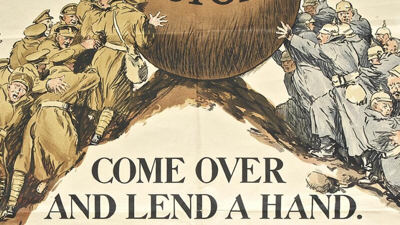 An example estimated at only €100-€150 and dating from 1915, has the slogan “Come Over and Lend a Hand” and the message: “Irishmen, your comrades are calling. There is still time for you to share in the glory of victory”.
