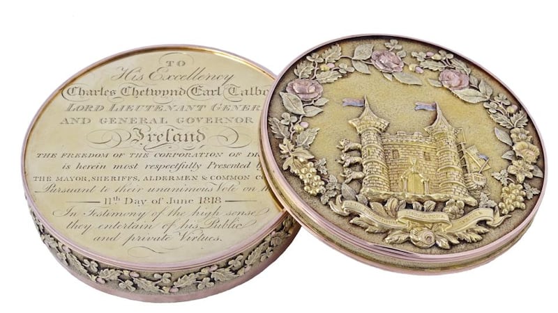 Among the highlights: a George III "Irish vari-coloured gold inlaid silver gilt" box, made in Dublin in 1816, and presented to "His Excellency Charles Chetwynd, Earl Talbot, Lord Lieutenant General and General Governor of Ireland" when he was awarded the freedom of Drogheda (€15,000- €20,000); a copy of The Compleat Horse-Man and Expert Farrier by Thomas De Grey, published in London in 1670, (€2,000-€4,000); and, a Victorian silver-mounted snuff box, made from the hoof of the race horse, Emilius, winner of the 1893 Derby (€1,500- €2,000).