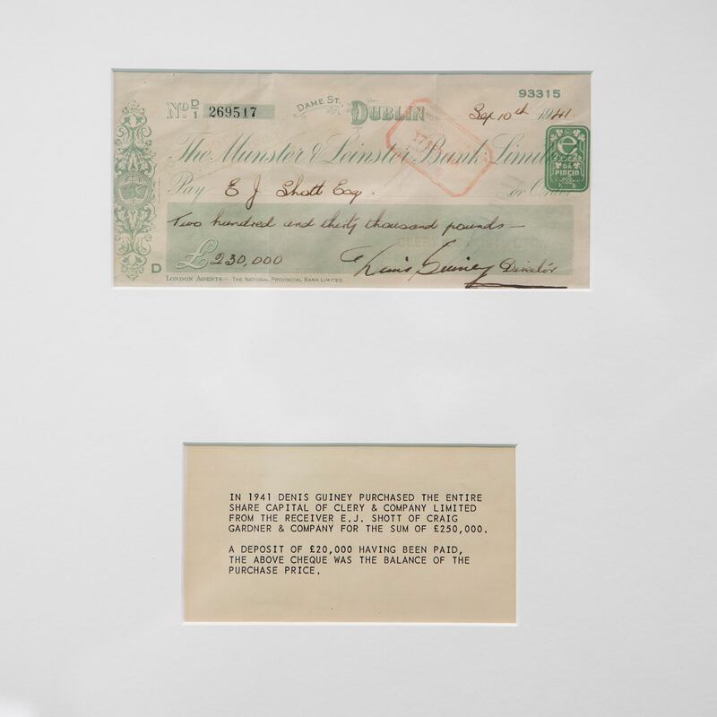 Clery’s went into receivership in 1941 and was bought by the businessman Denis Guiney for £250,000. The cheque written by Mr Guiney for £230,000 (he had already paid a deposit of £20,000) is also in the auction with a top estimate of £1,500.