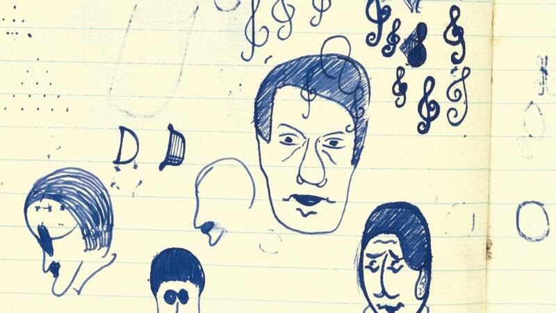 The notebooks are illustrated with "lively doodles" including recognisable portraits of James Joyce, Beckett himself, and Charlie Chaplin, as well as astrological symbols and musical notations.