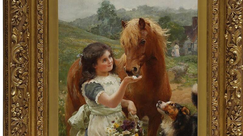 Examples include World Domination, Four Puppies in a Library over a Creased Map of the World by John Hayes (€8,000-€15,000); and Sweet Tooth (Young Girl with Sheep Dog Feeding Sugar to a Pony) by Alfred William Strutt (€12,000- €18,000). Both in elaborate frames.