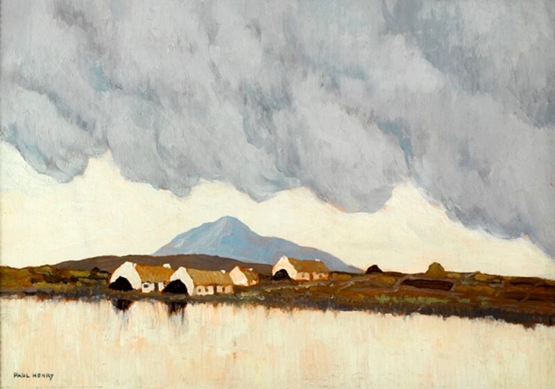 It’s a classic Paul Henry – thatched, white-washed cottages, stacks of turf etc and the location is believed to be Achill. This is one of many similar paintings by the artist and this one was a wedding present to a family in Co Tyrone in the 1940s but was later sold and up in the Taylor Gallery in Belfast where it was acquired by the vendor.