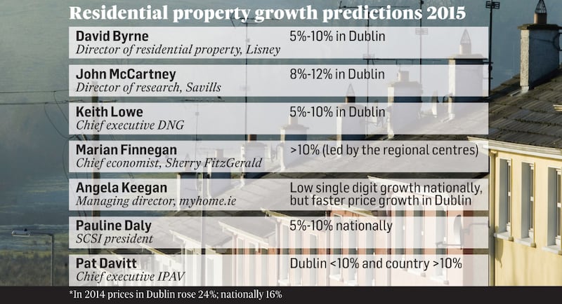 The pressure-cooker situation building in the capital around rising rentals and a limited supply of houses is likely to push buyers out to the regions, and 2015 may be the year when the commuter-belt counties of Kildare, Meath and Wicklow see real growth. Lowe envisages areas of Dublin that have recovered more slowly than others, such as west and north Dublin, will see stronger growth as a result of price inflation in more prime areas.