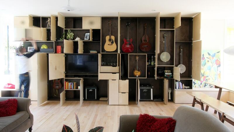 The floating bed is accessed via a set of steps and the sleeping quarters has a glass roof and large floor-to-ceiling glazing, screened off by striped blinds. The cubic volume of the under-bed storage on offer is sizeable and is most easily accessed if you use custom-built deep drawers. Tallaght-based Emyvale Joinery can do something similar in MDF, in any RAL colour with push button drawer openings, from about €2,550, excluding the bed. Adding storage drawers into the steps will cost an additional €300.