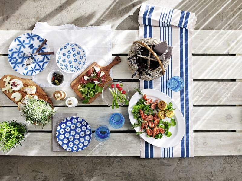 Minimise breakages outdoors by serving lunch on melamine tablewear. Take a leaf out of Marks and Spencer's summer catalogue (marksandspencer.ie) and team Indigo dinner plate, €5.50, side plate, €4.75, bowl, €5.50 and acrylic high ball tumblers, €5, with high-end napkins, €13 for a hemstitch design and €20 for a crochet bordered style.
