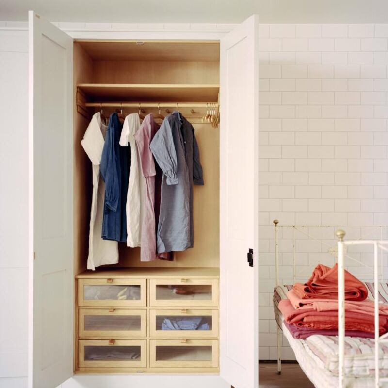 Get organised with this cedar- lined bedroom cupboard by Suffolk-based Plain English Design (00-44-144-9774028 plainenglishdesign.co.uk). The freestanding wardrobes are styled on antique furniture with open, closed and glass-fronted internal drawers. This one is painted in Pavilion Grey by Farrow and Ball. Prices are steep, starting from about €6,462 (Sterling £5,000) ex delivery, per wardrobe.