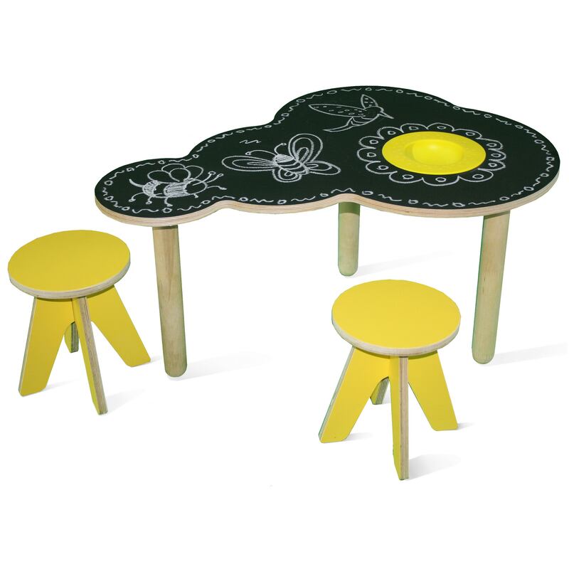 This cloud-shaped beech ply chalkboard table, 41cm by 80cm by 59cm, has a built-in food-safe silicon bowl, perfect for chalks or snacks, and comes with a pair of sunny stools, 26cm by 21cm. The flat-pack design costs €289, ex-delivery, from Clare Loves (clareloves.co.uk).