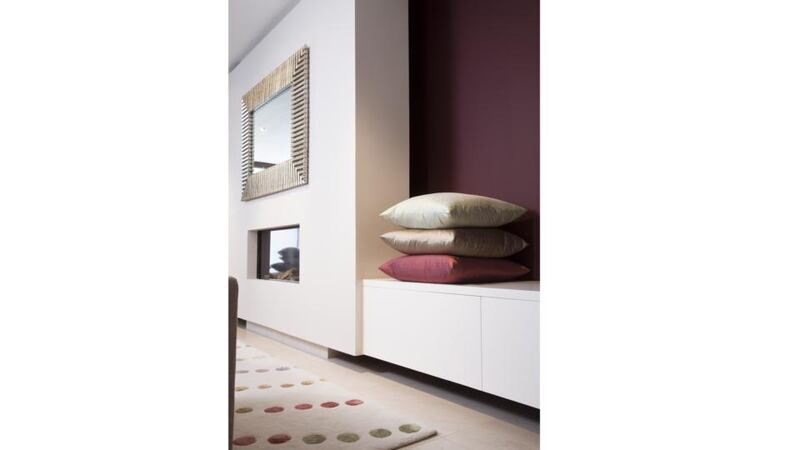 The room was a very modern space so we went for a contemporary look and because the space was so large, we painted the wall behind in a gorgeous dark burgundy which contrasted beautifully with the white storage units and instantly made the room feel cosy.