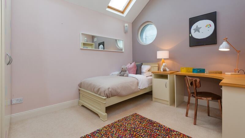 Space has been cleverly thought through in this upper level bedroom. The porthole window, skylight, double height ceiling, fitted wardrobe and corner desk unit make it light and roomy. 1A Lower Albert Road, Sandycove, Co Dublin. Price: €1.435m