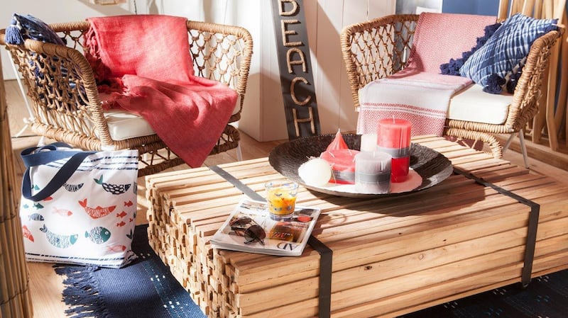 One affordable brand worth investigating is Amadeus and includes these outdoor and sunroom perfect pieces, rope-knotted armchairs, €229 each, and a driftwood-inspired coffee table held in a steel frame, €449, both available to order from Sallynoggin-based M. Kelly Interiors.