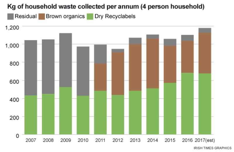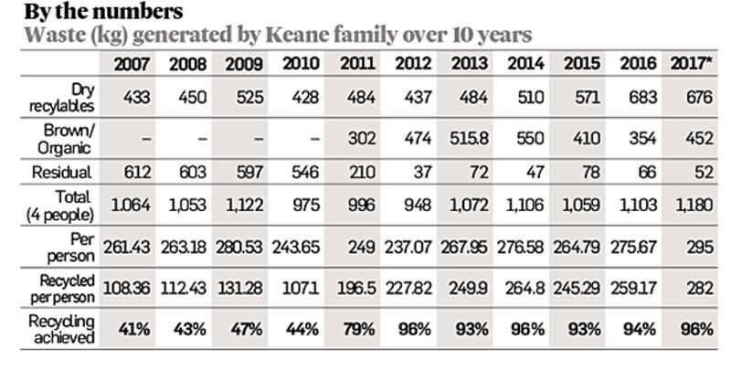 One tonne, or 1,000 kilos is pretty average, he says. But according to preliminary figures produced by the Environmental Protection Agency for 2014 most adults produce 331 kilos per annum so the Keanes produce 25 per cent less waste than the rest of us.
