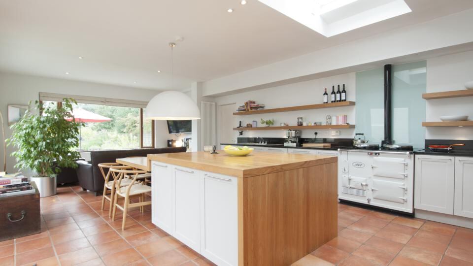They built out extensively to create a really good kitchen-living-diningroom. The kitchen area comprises a large thick oak-topped island with a step down square dining slab with seating on three sides. The storage units are set against the wall and mainly below the counter which helps the room to breathe and knits the livingroom area, where a large picture window frames a view of garden, to the rest of the space. It was installed and designed by Wabi Sabi two years ago.