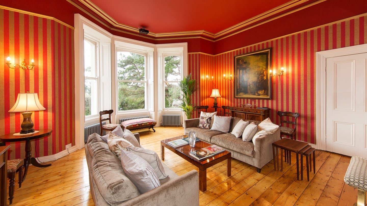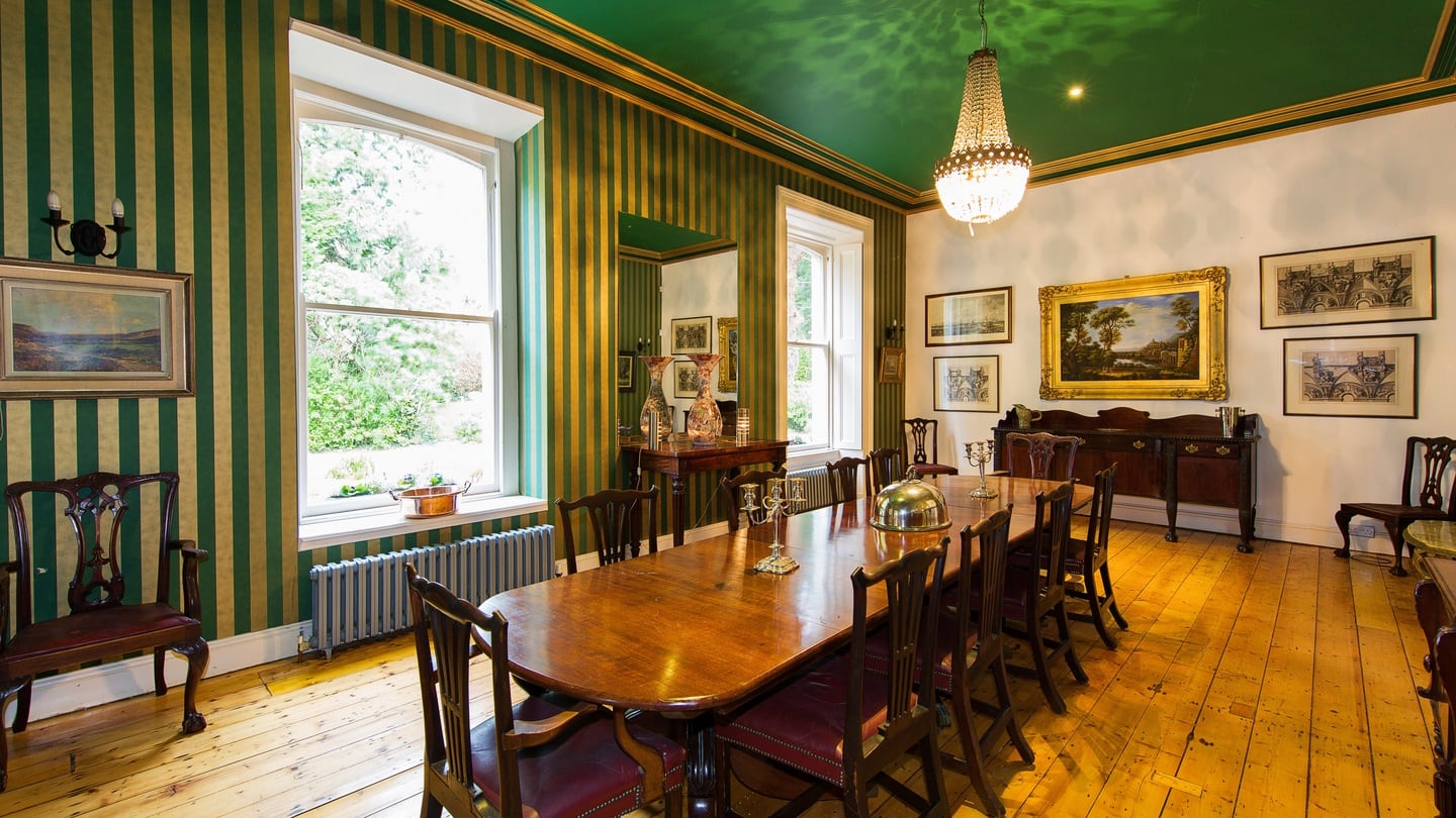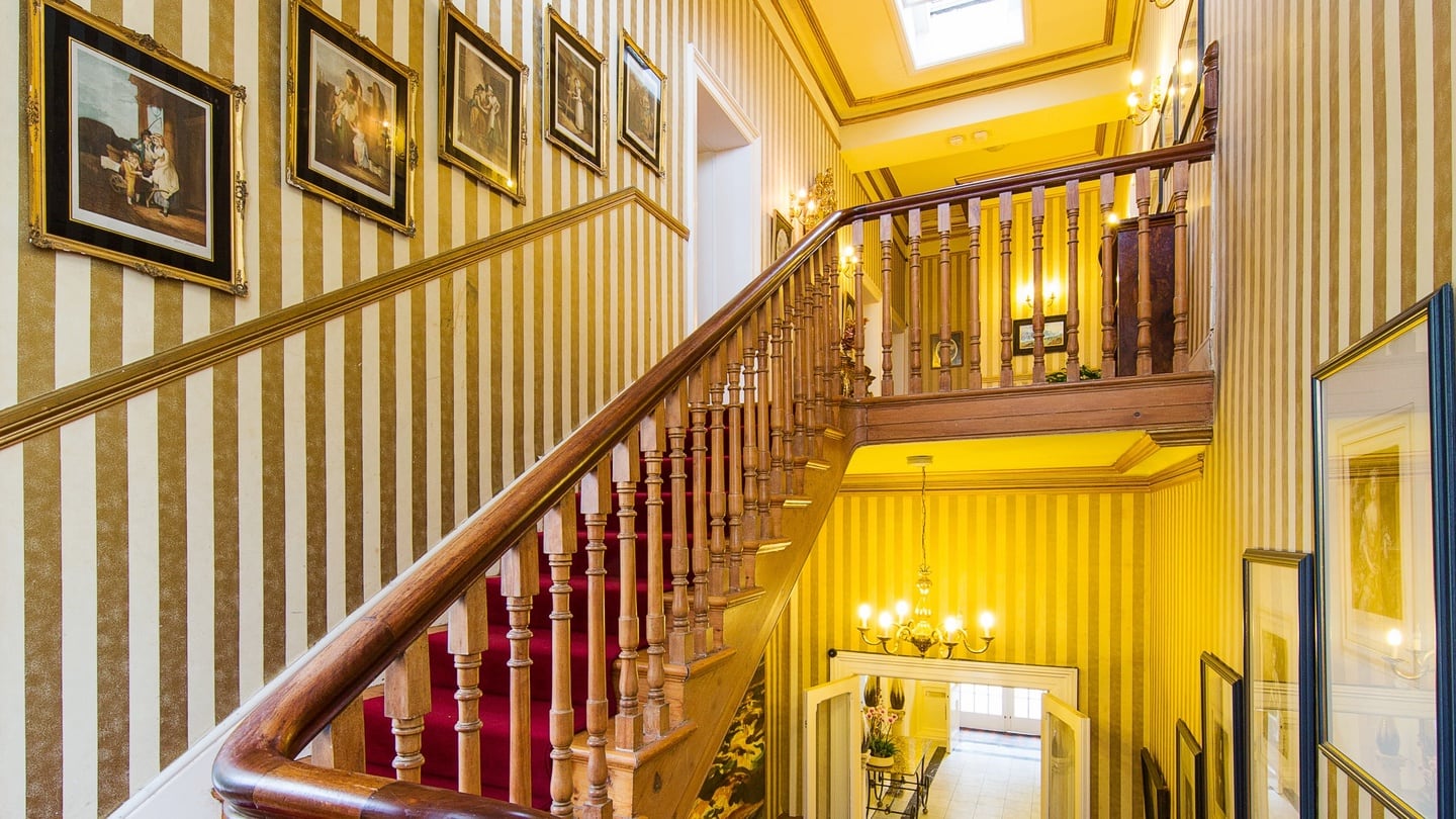 The ground floor has its full complement of reception rooms, which are currently papered in rich jewel and gold stripes, and are all very gracious, with high ceilings, bay windows and lots of lovely original features. To the right of the hall is a study, a diningroom large enough – should you prefer to eat on the lower level – for a snooker table (it has been used that way in the past), and pantry, while to the left are a pair of beautiful formal rooms, with a music room off.