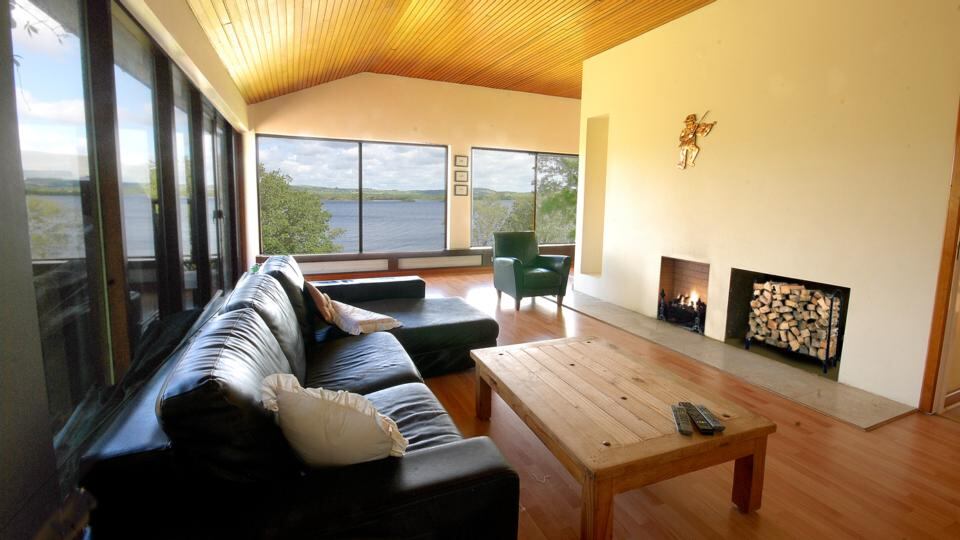 An open hearth divides the sitting room from the kitchen, where two more picture window walls showcase Mother Nature's fine work on Lough Corrib.