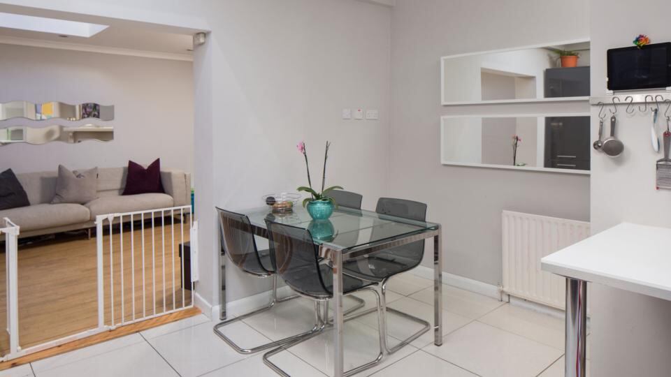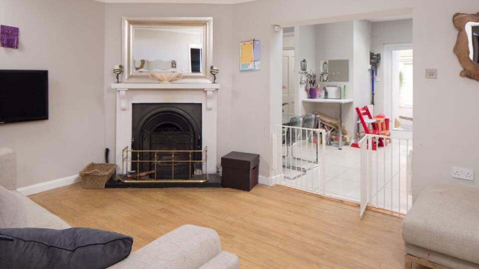 The living area, thanks to the vaulted ceiling is bright, and features a large open fireplace as a centrepiece. This in turn leads to a high-gloss gunmetal grey kitchen by Ikea which opens out to the decked city garden through French doors.