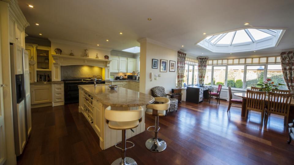 On the first floor, the bay-windowed, L-shaped en-suite master bedroom features a marble fireplace with a gas fire and built-in wardrobes, also by John Daly. There are three other bedrooms on this floor – two of them en-suite – and a separate bathroom.
