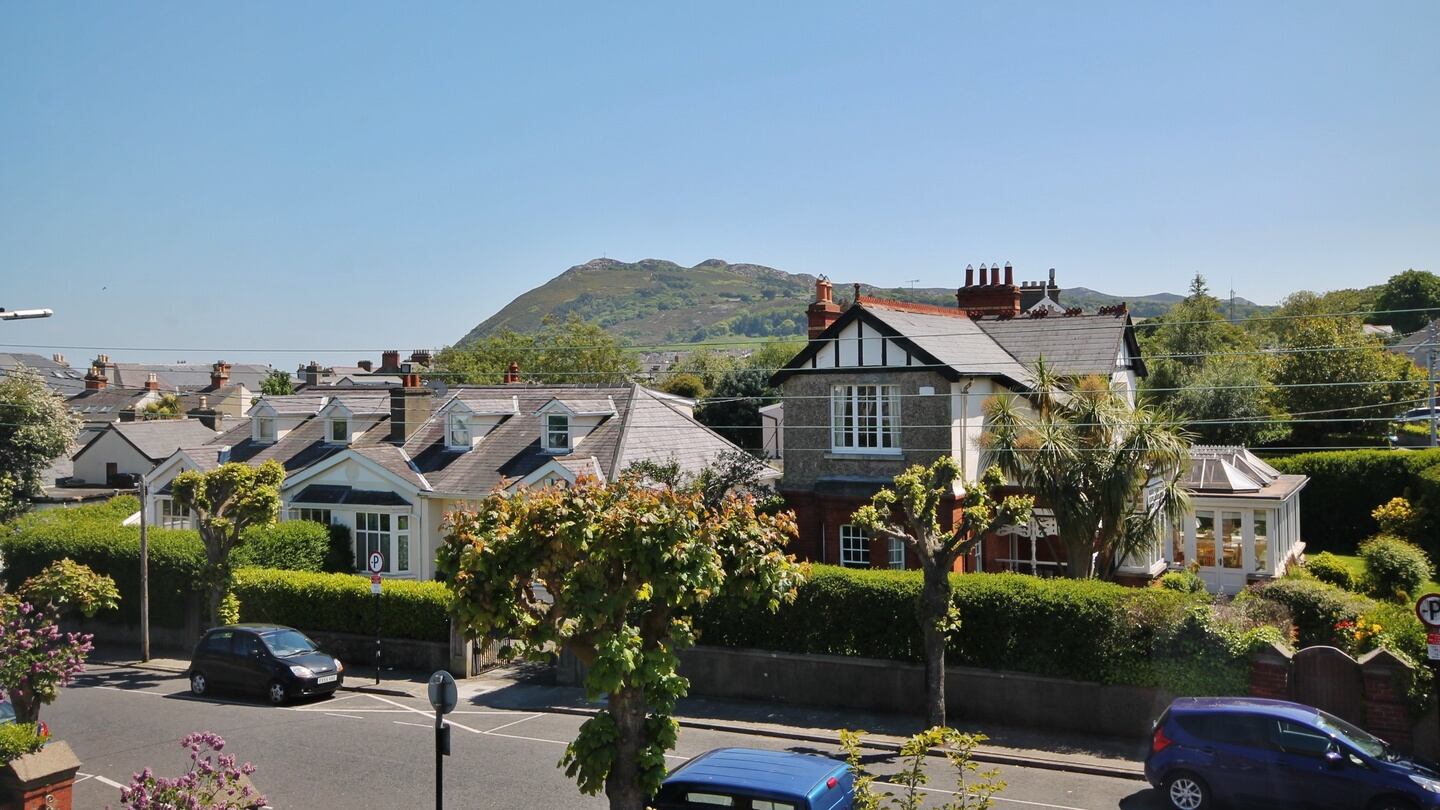 Upstairs, there's a view from the landing on the return of the neat green lawn of Bray Bowling Club, just around the corner on Adelaide Road. There are five bedrooms upstairs: the main bedroom has the same deep square box bay window as the livingroom below it. A bedroom at the back of the house has an unusual triangular window overlooking the back garden. There's a family bathroom and separate toilet on this floor too.