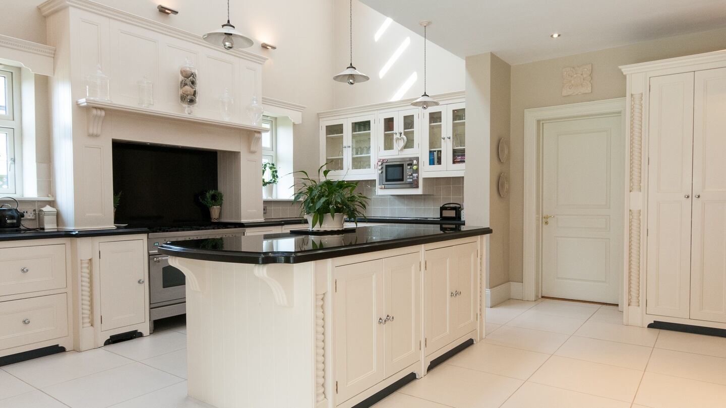 The entrance hall, through the double front doors, gives a hint of the spec and design approach in the rest of the house. It’s a very large and bright space with Portuguese limestone flooring and a sweeping curved Portuguese limestone staircase together with custom-made ornate ironmongery.