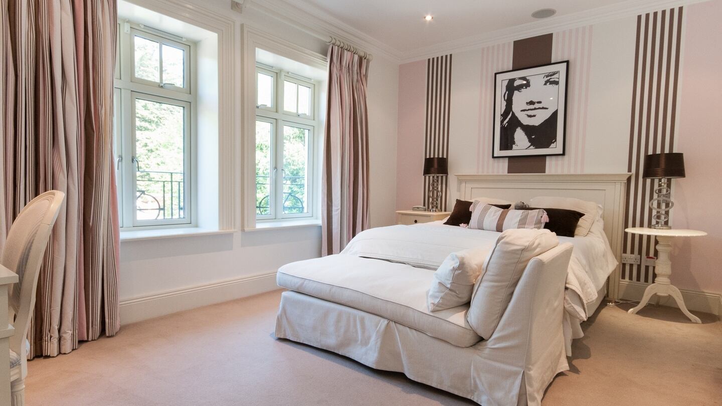 Upstairs off the large landing are five double bedrooms. Each has a dressing area and either its own en suite or access to a shared Jack and Jill style en suite. The largest is fitted with a reclaimed period fireplace, and with a large bathroom with both freestanding bath and walk-in shower as well as a separate walk-in dressingroom fitted from top to bottom with walnut shelving and hanging spaces. This main bedroom opens out on to a balcony overlooking the rear garden.