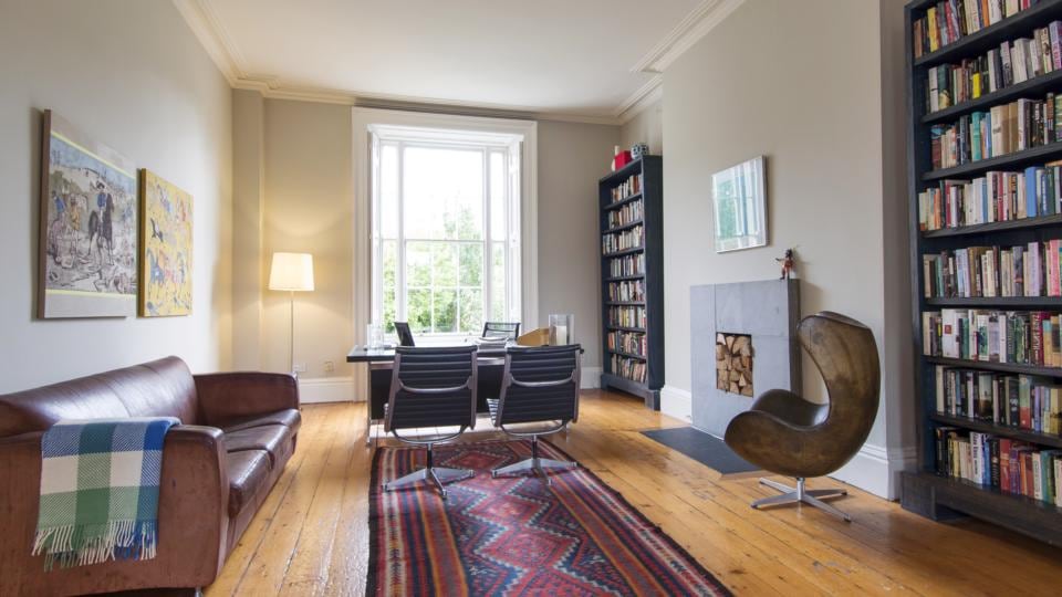 The atmosphere is relaxed, despite the formality of the period proportions. Go up a level to a gorgeous livingroom and the kind of library/study space you’d relish working in, and then up again to find three of the five bedrooms. The other two are at garden level.
