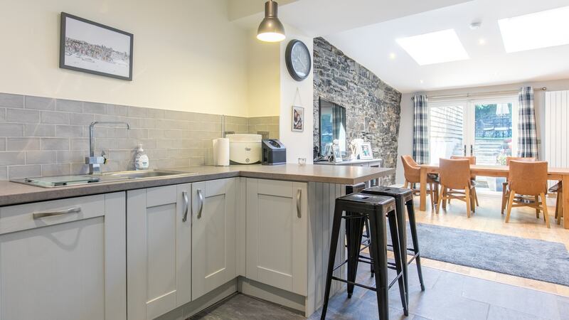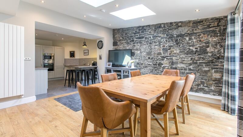 The back of the house has been opened up by an extension creating an open plan dining area and kitchen with rooflights and a feature stone wall. Double glazed doors open out to the garden. Also off this area is a door leading to a bedroom with a good sized bathroom en suite.