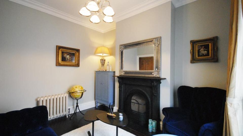 Reclaimed pitch pine flooring has been installed in the hall and formal living room at the front, where coved ceilings and cast-iron reproduction fireplace and free-standing Victorian-style radiator chime with the age of the house.