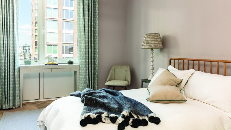 Two two-bed showhouses have been decorated to distinctly different designs by North Design and Interiors Atelier. All of the units have glazed elevations and their own balcony or terrace, and depending on where the unit is located in the building some will enjoy Liffey views though not quite as expansive as those from the offices to the front of the building. One two-bed penthouse takes in a lovely sweep from Tom Clarke bridge to the lockkeeper’s house in Ringsend and the Dublin mountains in the distance.